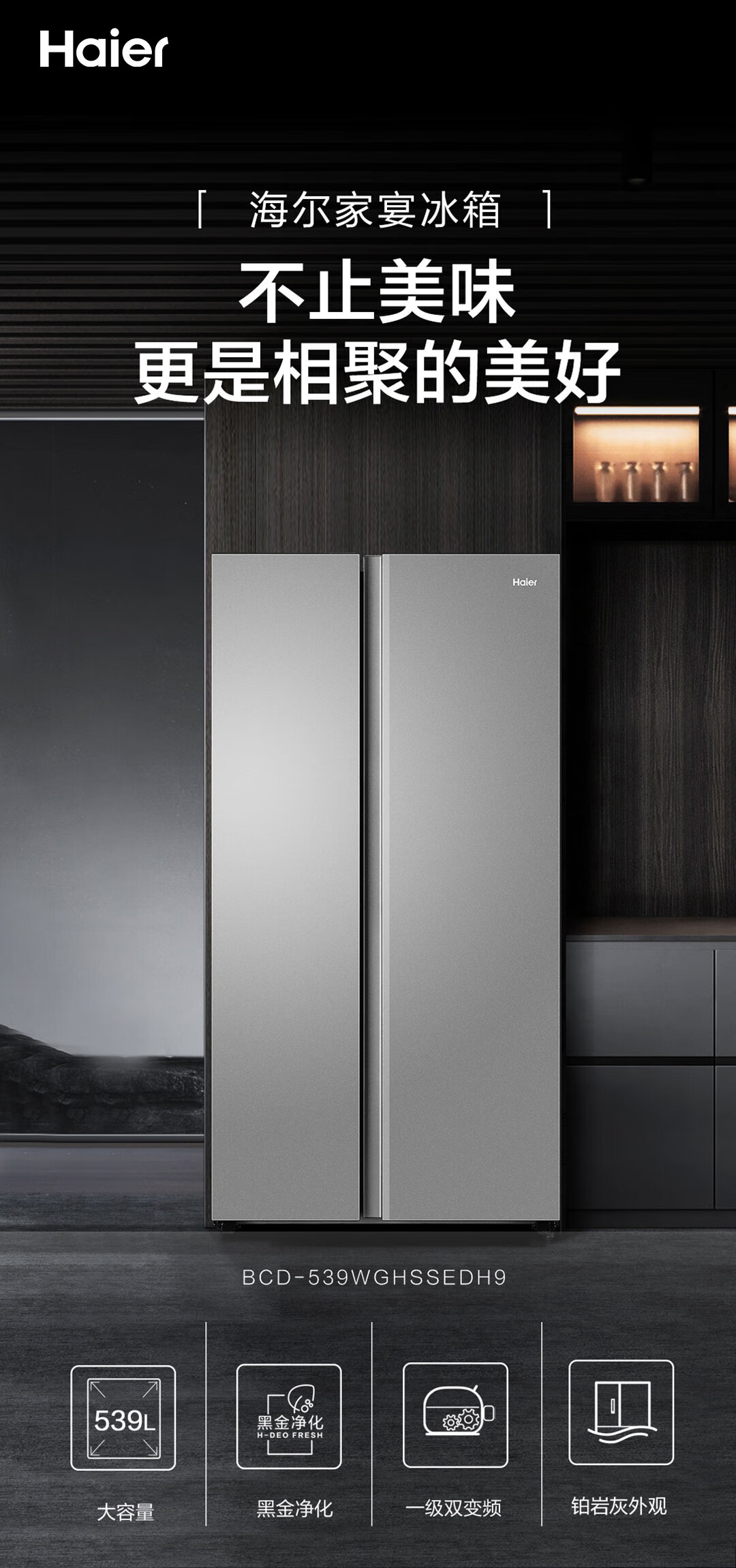 海尔(Haier)539升风冷无霜对开门家用电冰箱双开门一级能效变频节能535升级款BCD-539WGHSSEDH9国家补贴20%