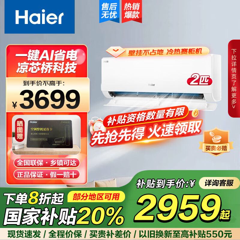 海尔(Haier)壁挂式空调挂机空调 大循环风量 一键自清洁 一级能效变频节能挂机空调 2匹 一级能效 自清洁省电挂机空调