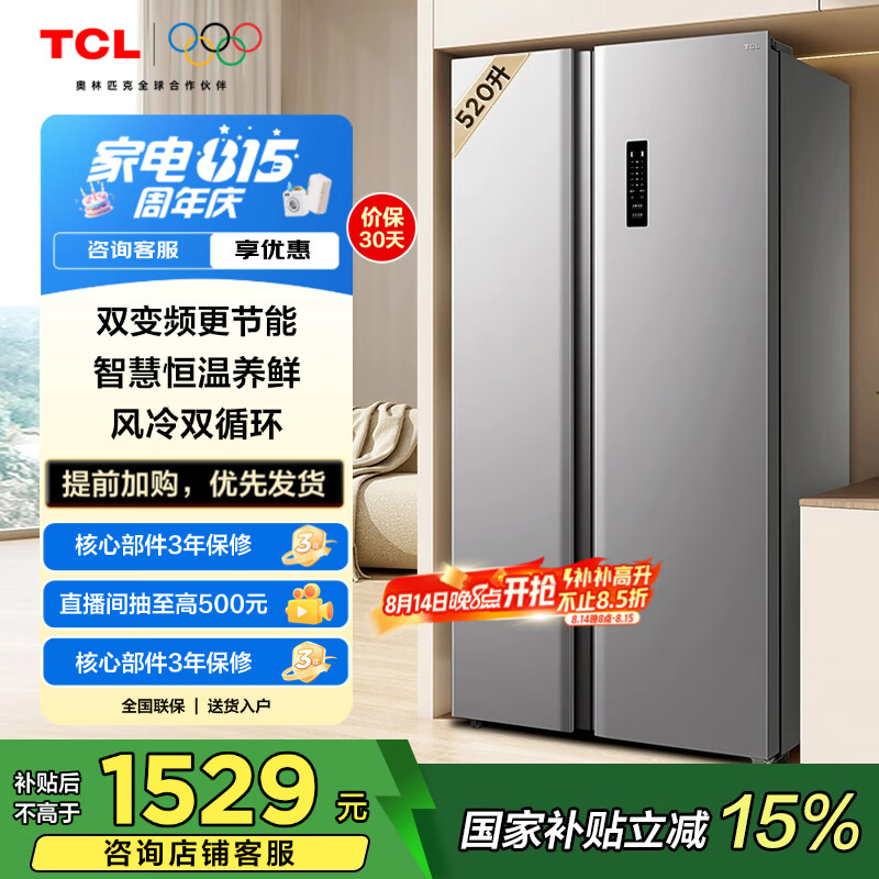 TCL 520升大容量对开门双开门冰箱精细分区一体式双变频双循环风冷无霜超薄机身家用电冰箱以旧换新 双开门冰箱 R520V1-S