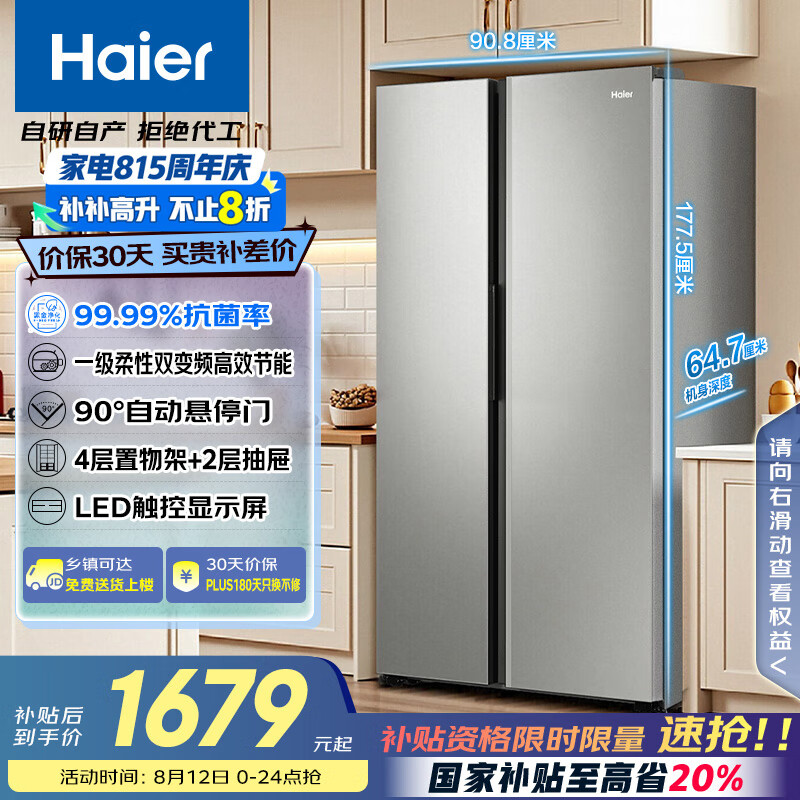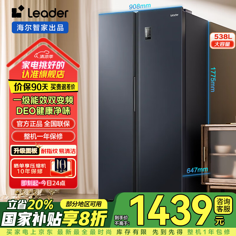 海尔智家冰箱对开门双开门538升大容量风冷无霜一级能效双变频家用电冰箱国家补贴20%Leader 一级双变频+风冷无霜+DEO净味