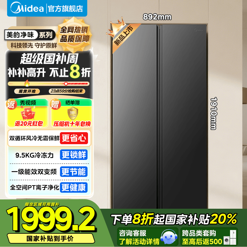 美的(Midea)606L大容量对开门冰箱双开门双变频一级能效节能省电家用超薄电冰箱风冷无霜净味 国家补贴20% 605/607 新品升级款Pro