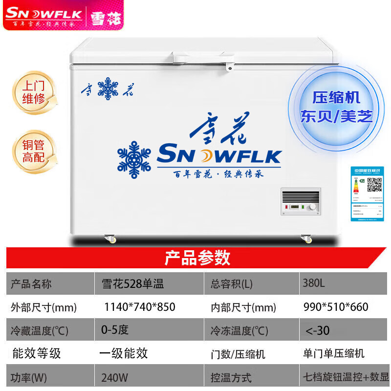 雪花(SNOWFLK)冰柜商用家用冷柜卧式大容量全冷冻柜展示柜 【528数显】单温扩容款一级能效 空柜温度可达-30度丨铜管速冷低耗