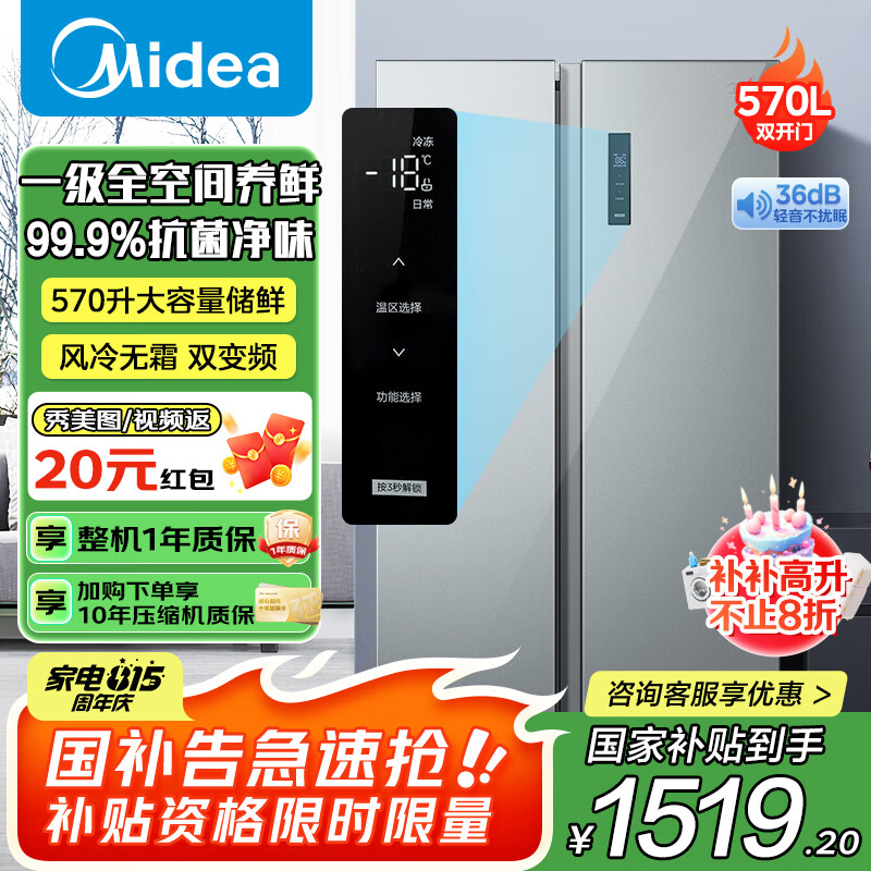 美的冰箱570升双开门对开门一级能效节能保鲜风冷无霜【550升级款】超薄大容量家用电冰箱 570升双开门BCD-570WKPM(E)