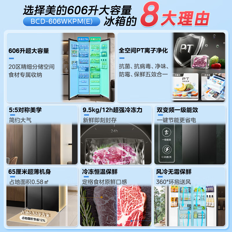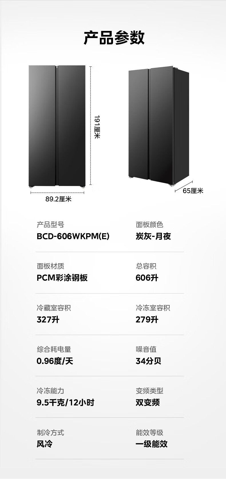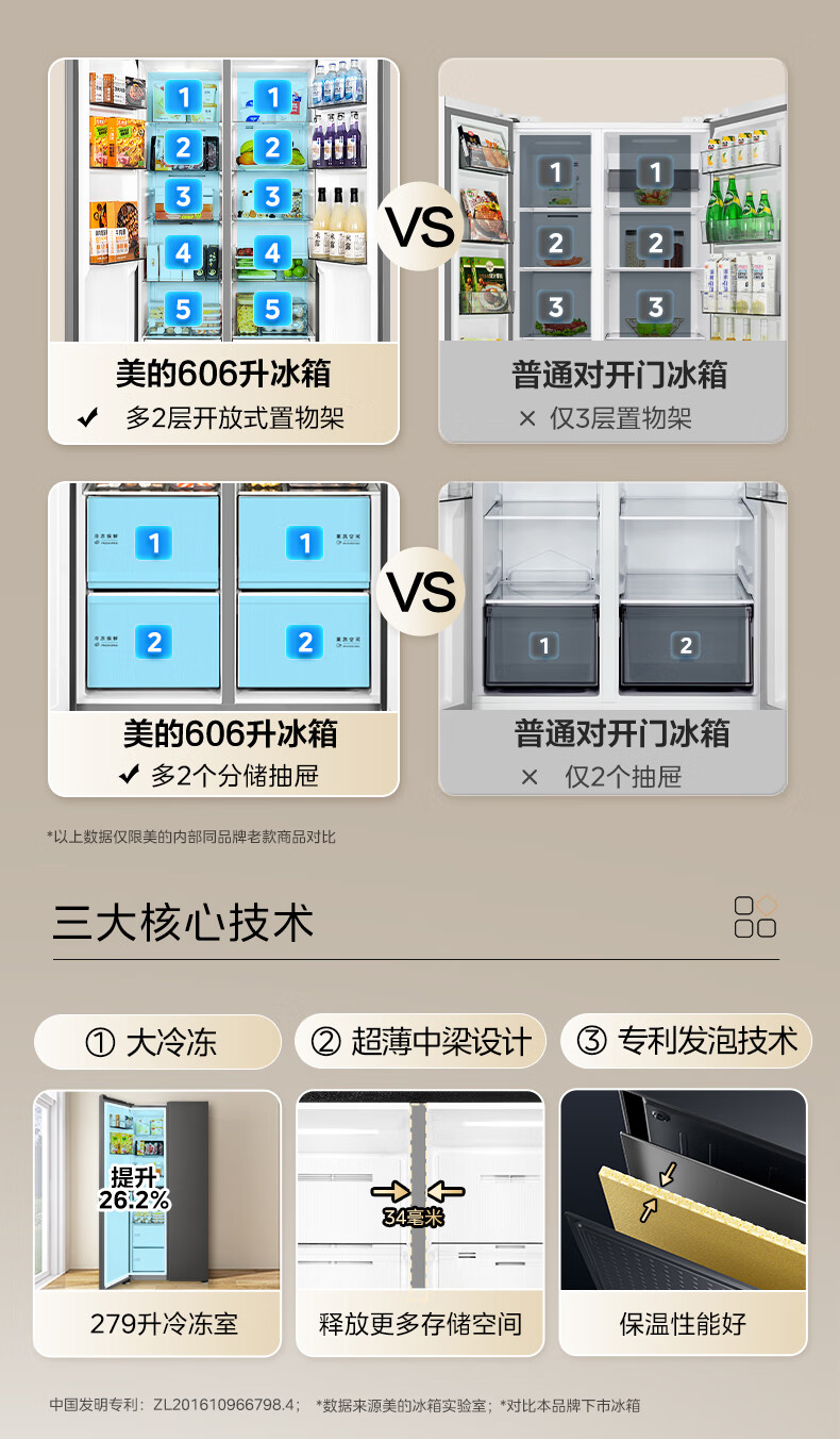 美的(Midea)606L大容量对开门冰箱双开门双变频一级能效节能省电家用超薄电冰箱风冷无霜净味 国家补贴20% 605/607 新品升级款Pro